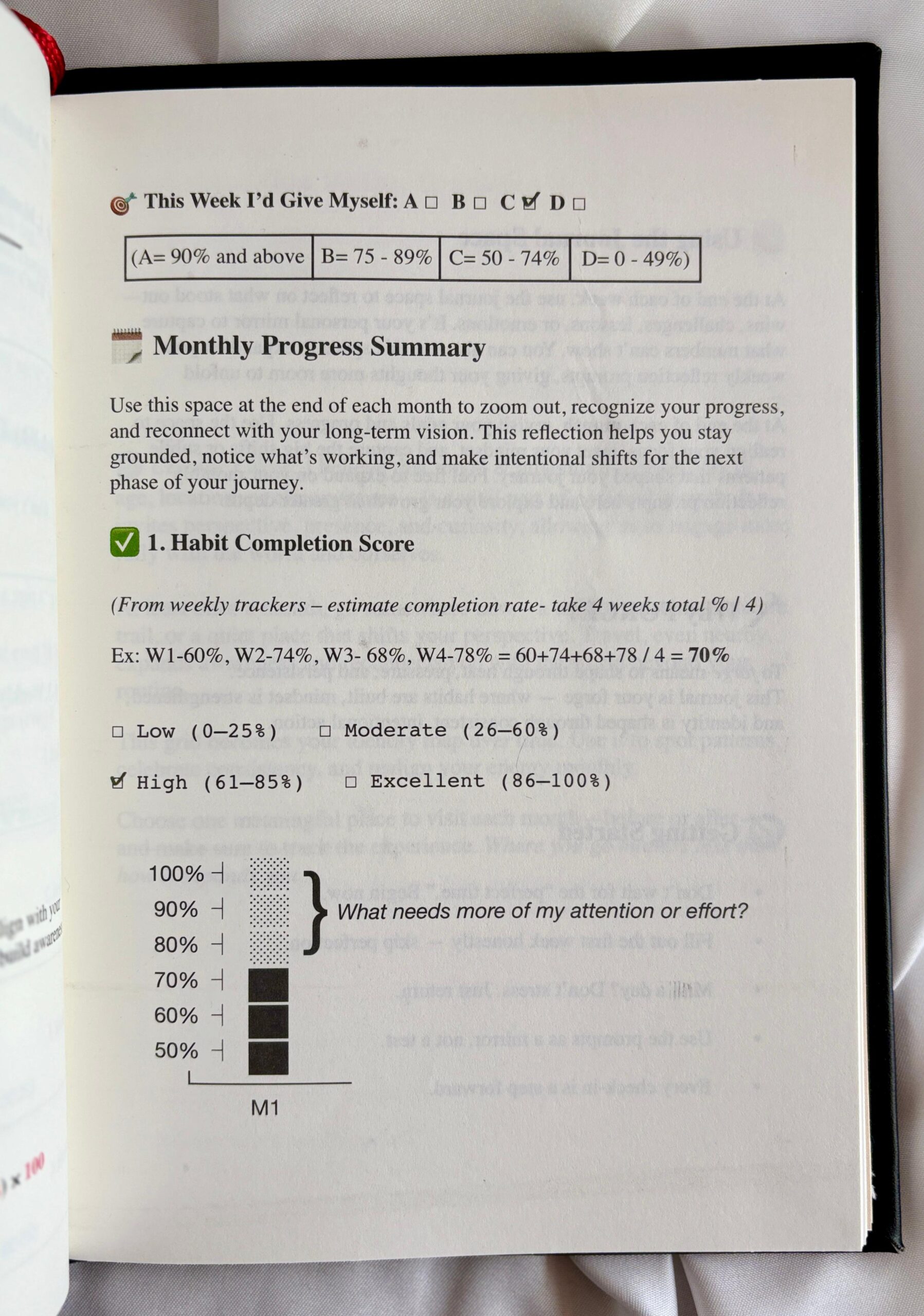 Monthly Progress Summaries – Visual graphs, grading, and guided reflections for each month.