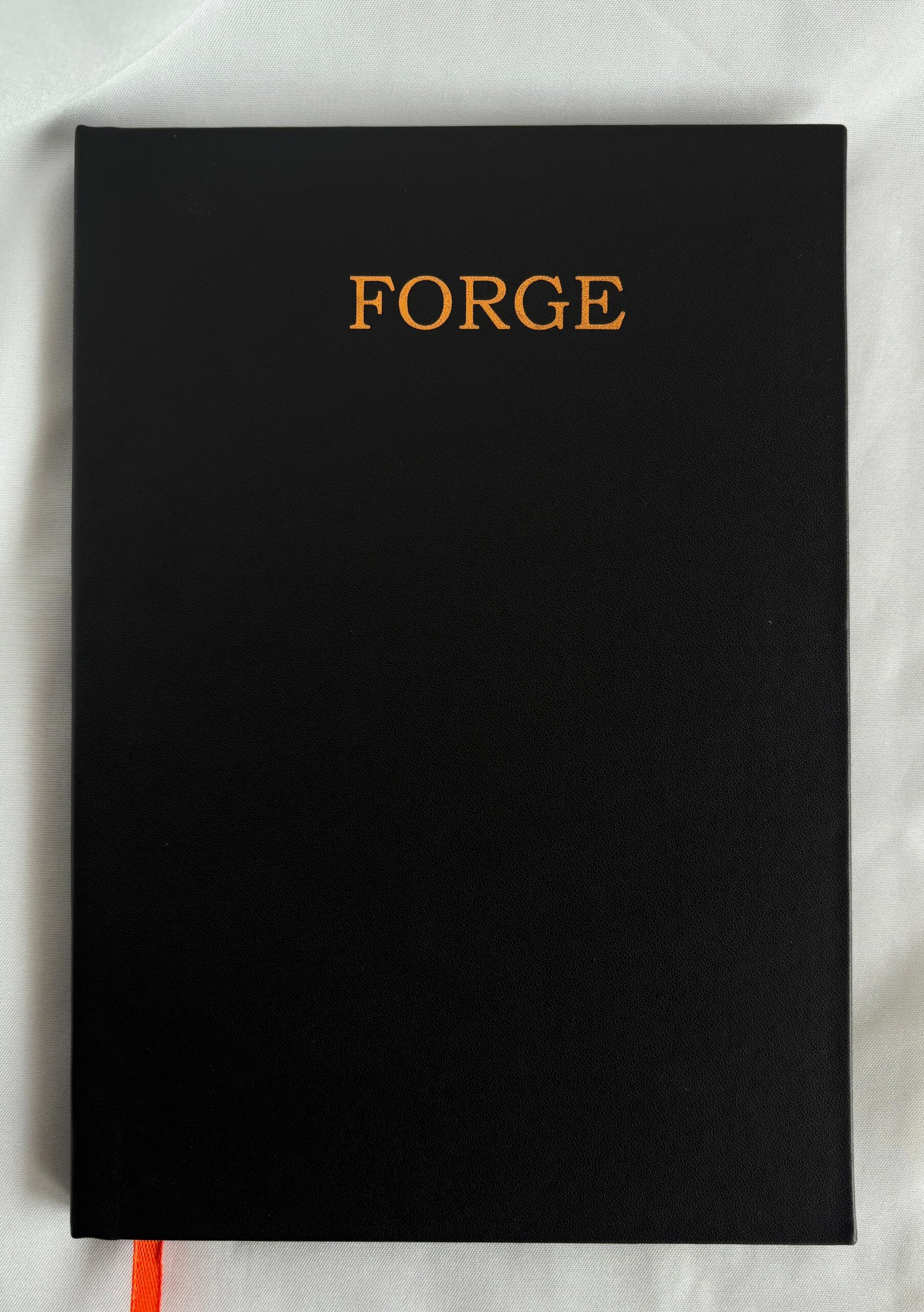 Durable A5 Hardcover Design – Premium black cover with bold metallic orange “FORGE”; minimal, powerful, and portable.
